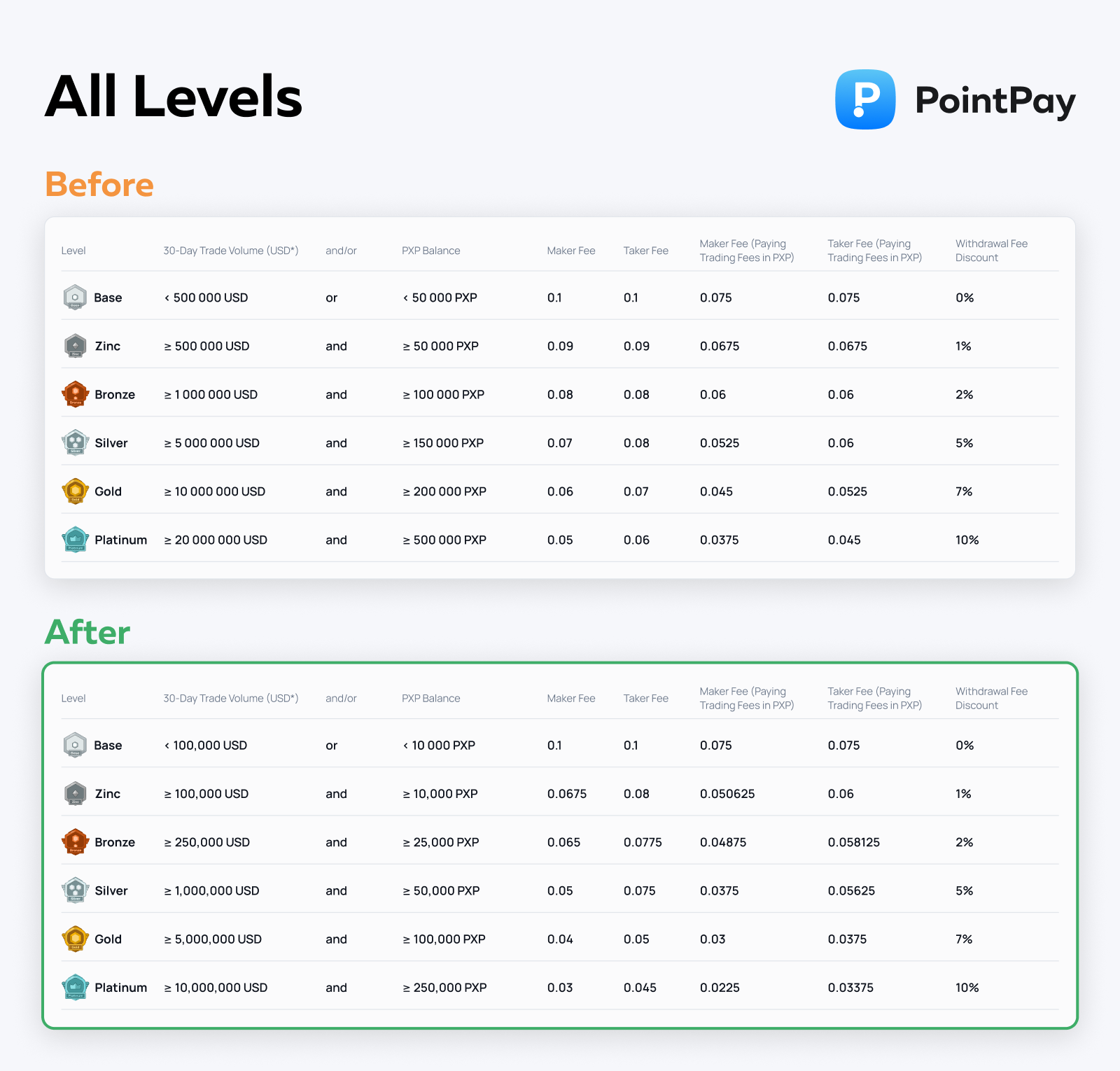 All levels, except Basic, now offer increased rewards of up to 30% when paying trading fees. These improvements apply to both payments in the traded currency and in PXP tokens, making your trading experience more efficient and cost-effective.