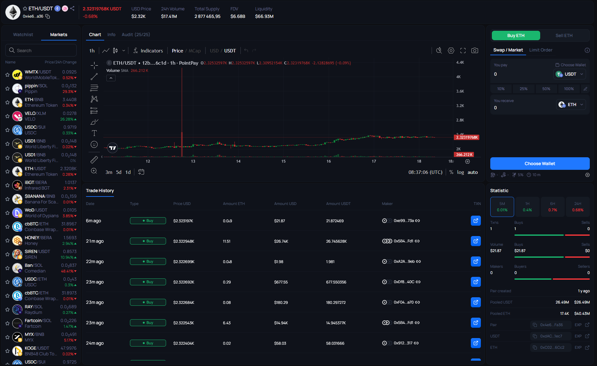 Swap and Spot Trading: Instant token swaps with high execution speed. You gain access to integrated TradingView charts, real-time liquidity data, and smart contract audit status. Every transaction is fully transparent.
